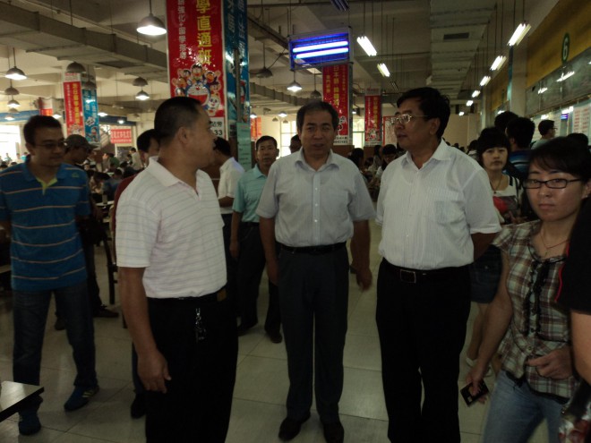 2011年8月29日中午,校党委书记乔学光、校党委副书记李映方、校党委常委、工会主席王望弟和学生工作部(处)、党办、校办、后勤集团等单位领导分别检查了长安校区、太白校区学生食堂开学来的伙食供应工作。 在察看过程中,乔书记分别对长安校区四个餐厅饭菜的价格、品种、饮食卫生、餐具的消毒及餐厅环境等方面进行了全面的查访,并与就餐的同学、教工进行了亲切交谈,了解了他们在校就餐情况。李副书记对太白校区的学生餐厅、清真...