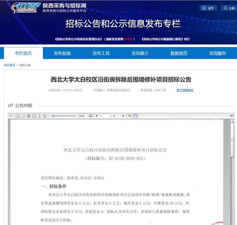 西北大学太白校区沿街房拆除后围墙修补项目招标公告